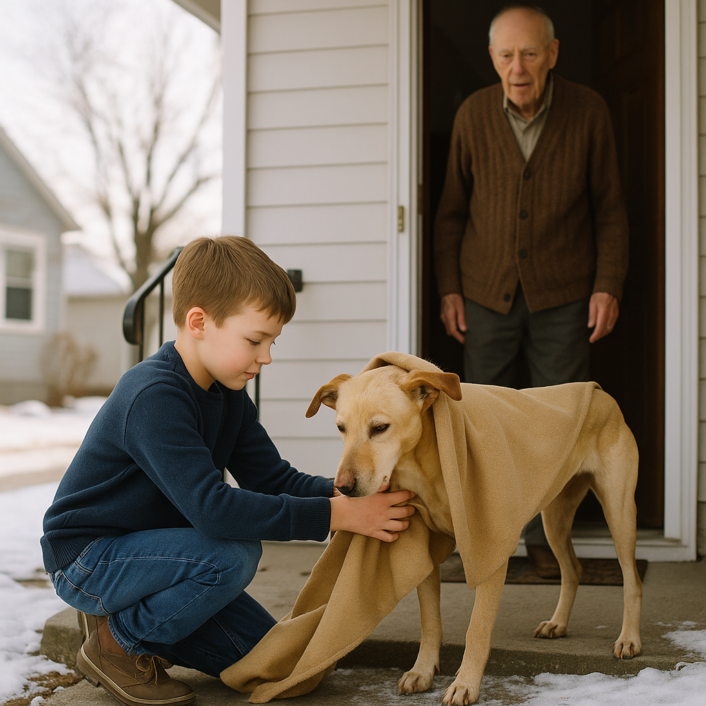 Coś zmieniło się w oczach pana Harrisa. Spojrzał na chłopca, potem na psa, a jego wzrok zwilgotniał. Bez słowa zniknął w środku i wrócił z wyblakłym niebieskim ręcznikiem.