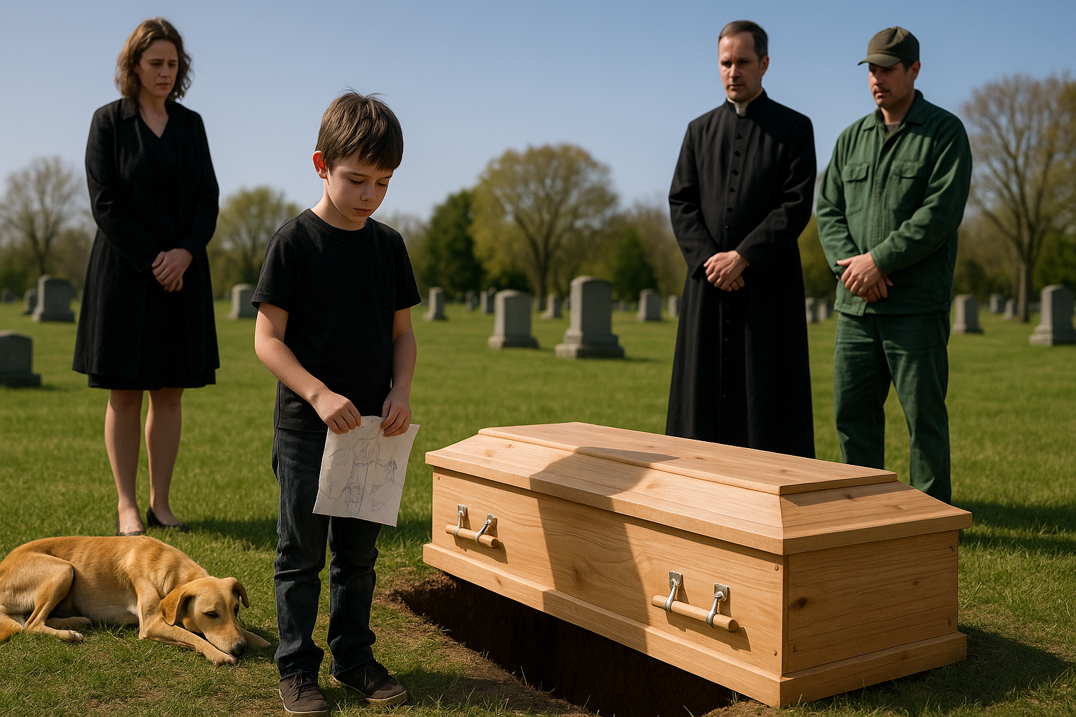 Lucky położył się obok grobu, z głową na łapach, obserwując opuszczanie trumny. Gdy pierwsza łopata ziemi spadła, pies wydał z siebie długi, urywany dźwięk, który wcale nie przypominał szczekania.