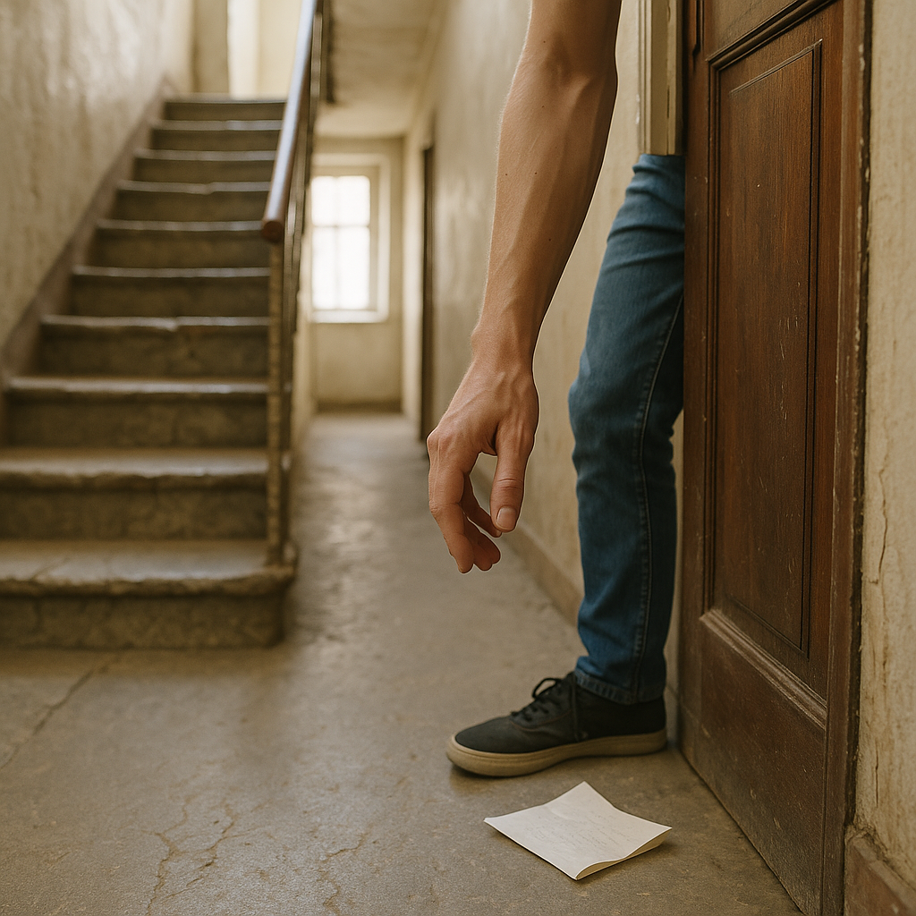 Trzeciego dnia usłyszałam powolne, chwiejne kroki w korytarzu, a potem cichy szelest przy drzwiach. Kiedy je otworzyłam, korytarz był pusty, brzęczała tylko przyćmiona żarówka. Na podłodze leżała kolejna karteczka.