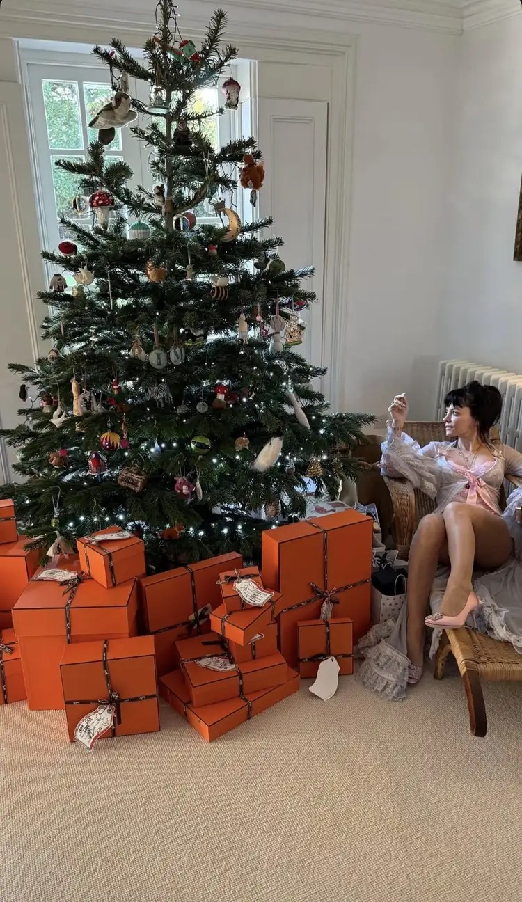 Uwagę przykuwał jednak nie tylko strój, ale tło. Pod rozświetloną choinką znajdował się rzucający się w oczy stos jaskrawopomarańczowych pudełek Hermès, które natychmiast przemieniły scenę w świąteczną, pełną luksusu stylizację.