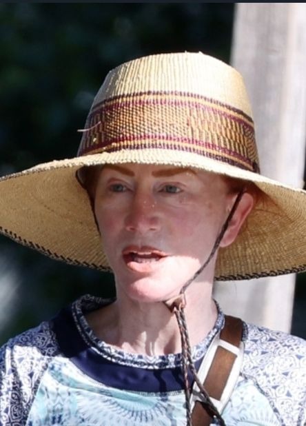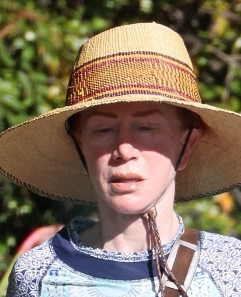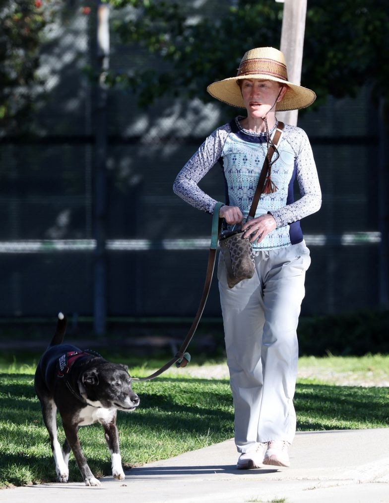 Podczas spaceru Kathy postawiła na całkowicie naturalną odsłonę. Zrezygnowała z makijażu, pozwalając, by obiektywy uchwyciły jej twarz bez żadnych upiększeń. Stylizacja była luźna i codzienna — niebieski top, szerokie szare spodnie i wygodne sportowe buty. Całość uzupełniała niewielka saszetka oraz słomiany kapelusz, który chronił twarz przed słońcem.