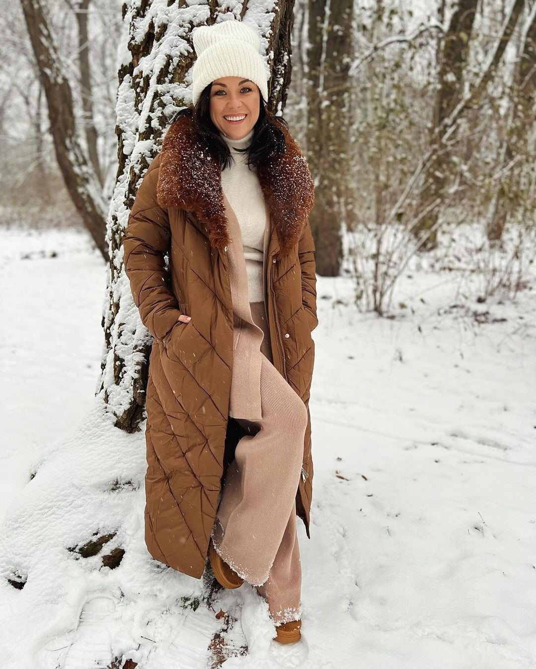 Na najnowszym zdjęciu Katarzyna siedzi w kawiarni z kubkiem herbaty. Cała stylizacja utrzymana jest w ciepłych, beżowych tonach. Czapka, sweter i buty tworzą spójną, zimową całość, a złote dodatki w postaci pierścionków i bransoletek dodają elegancji i lekkości.