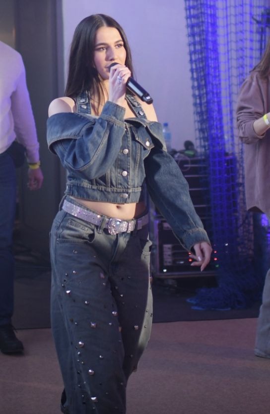 Artystka wybrała jeansowy zestaw — szerokie spodnie i krótką kurtkę z rozszerzanymi rękawami. Największą uwagę przyciągał jednak odsłonięty brzuch, który od razu stał się centralnym punktem stylizacji. W połączeniu z energicznym występem całość robiła mocne wrażenie i nie pozwalała oderwać wzroku.