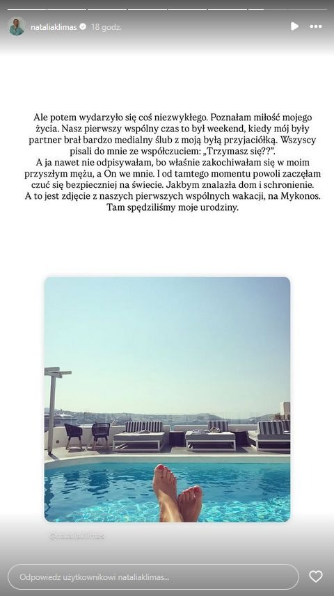 Natalia opisała ten moment jako początek poczucia bezpieczeństwa i spokoju, którego wcześniej jej brakowało. Wspomniała także pierwsze wspólne wakacje na Mykonos, gdzie spędziła urodziny i gdzie — jak napisała — poczuła się, jakby w końcu znalazła dom.