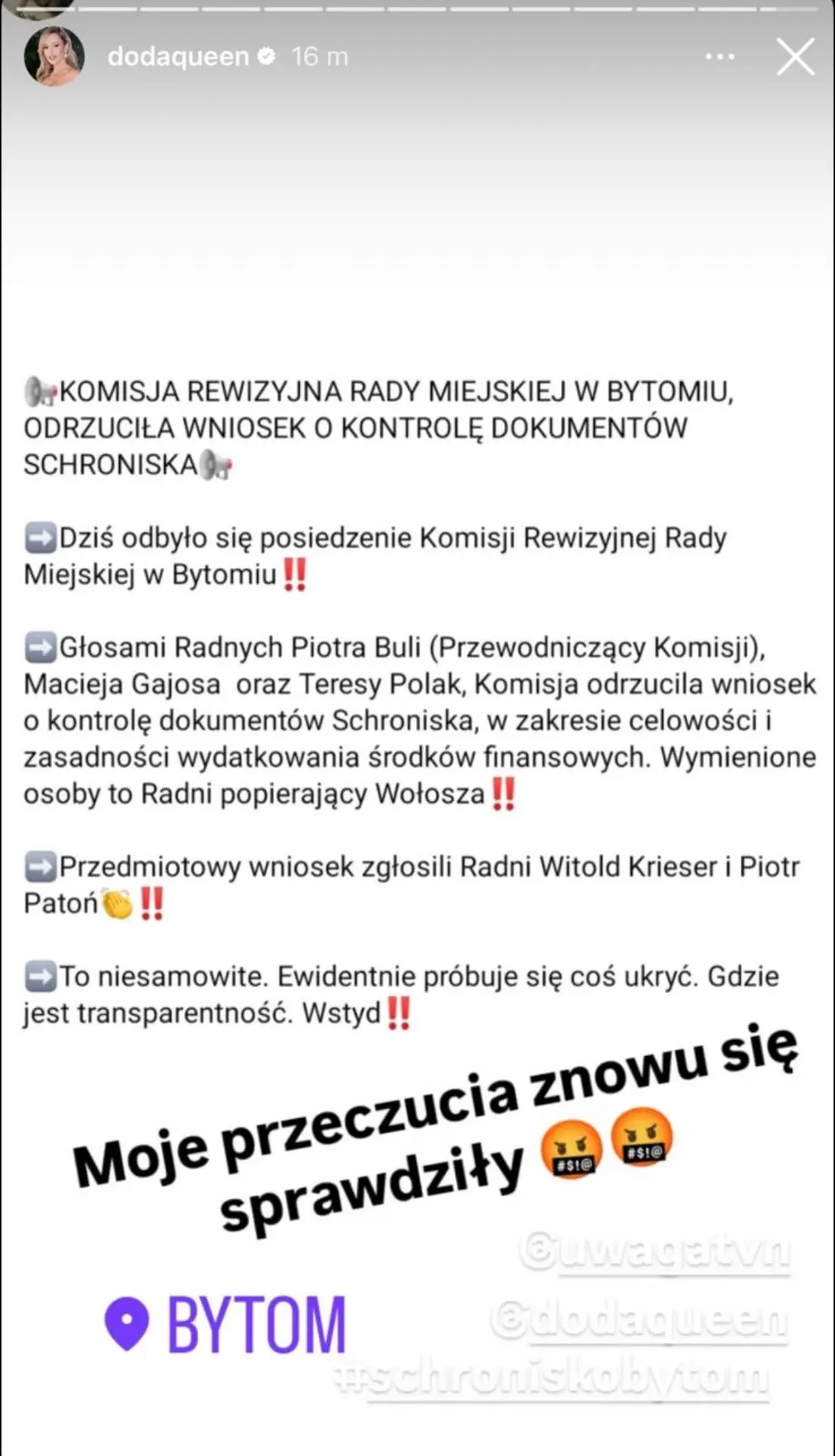 Punktem zwrotnym okazała się relacja opublikowana przez Dodę na Instagramie. Artystka udostępniła screen z posiedzenia Komisji Rewizyjnej Rady Miejskiej w Bytomiu. Z przekazanych informacji wynika, że wniosek o kontrolę dokumentów schroniska, w tym zasadności i celowości wydatkowania publicznych środków, został większością głosów odrzucony.