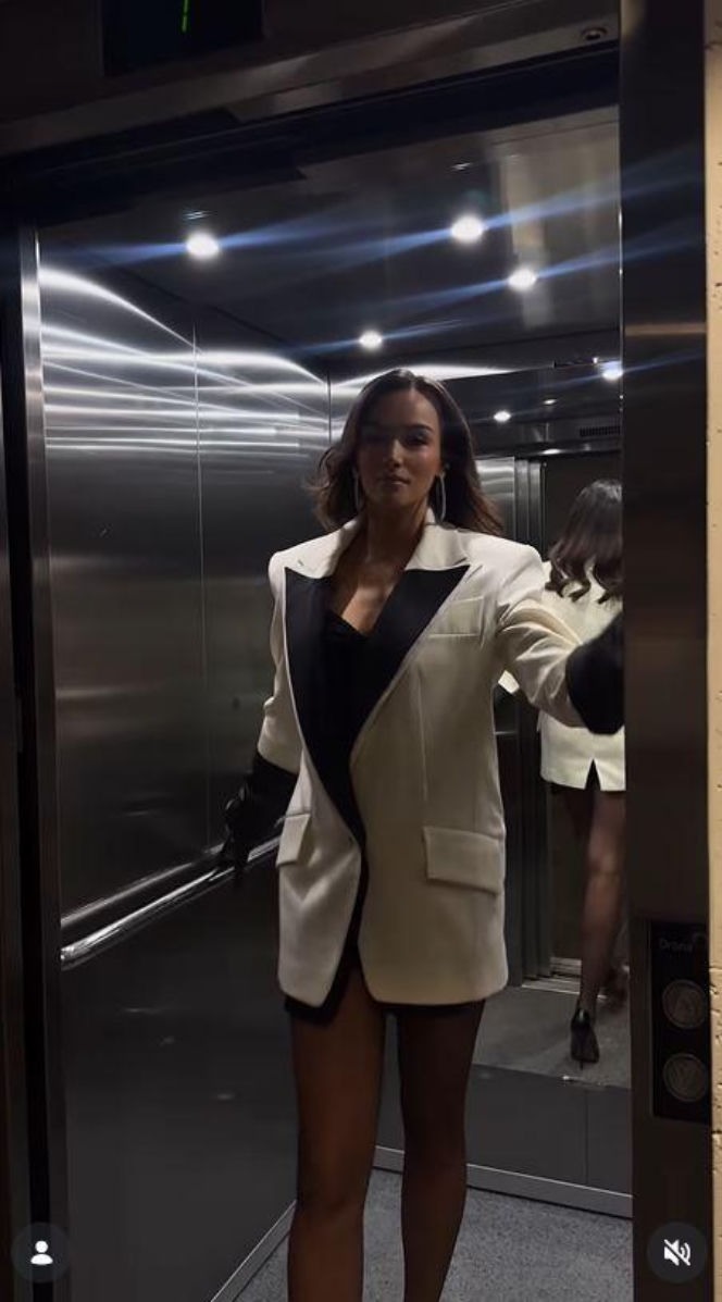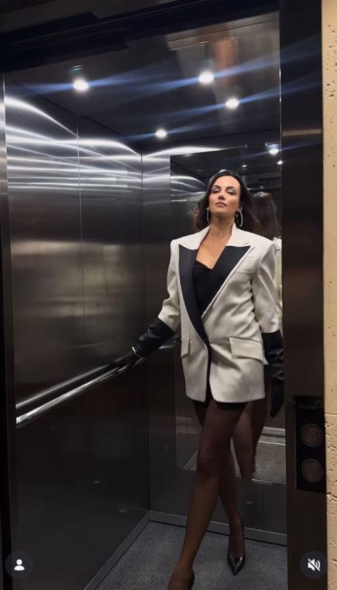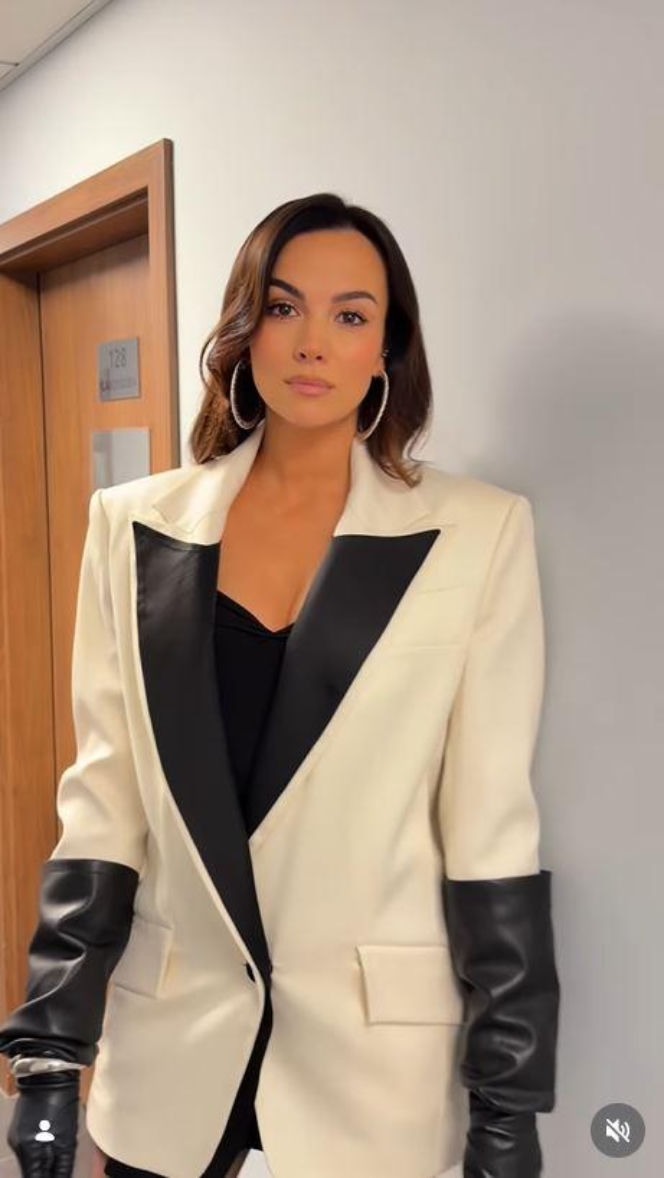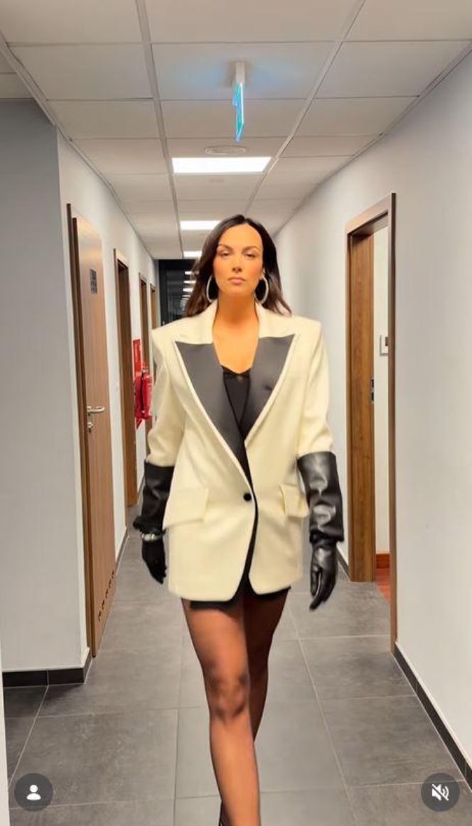 Na filmiku widać ją w obszernej, jasnej marynarce z kontrastowymi, ciemnymi akcentami. Pod spodem niewiele więcej niż czarne body, które w połączeniu z krojem marynarki odsłoniło jej długie, zgrabne nogi. Całość dopełniły masywne, skórzane rękawice, nadające stylizacji wyrazistego charakteru.