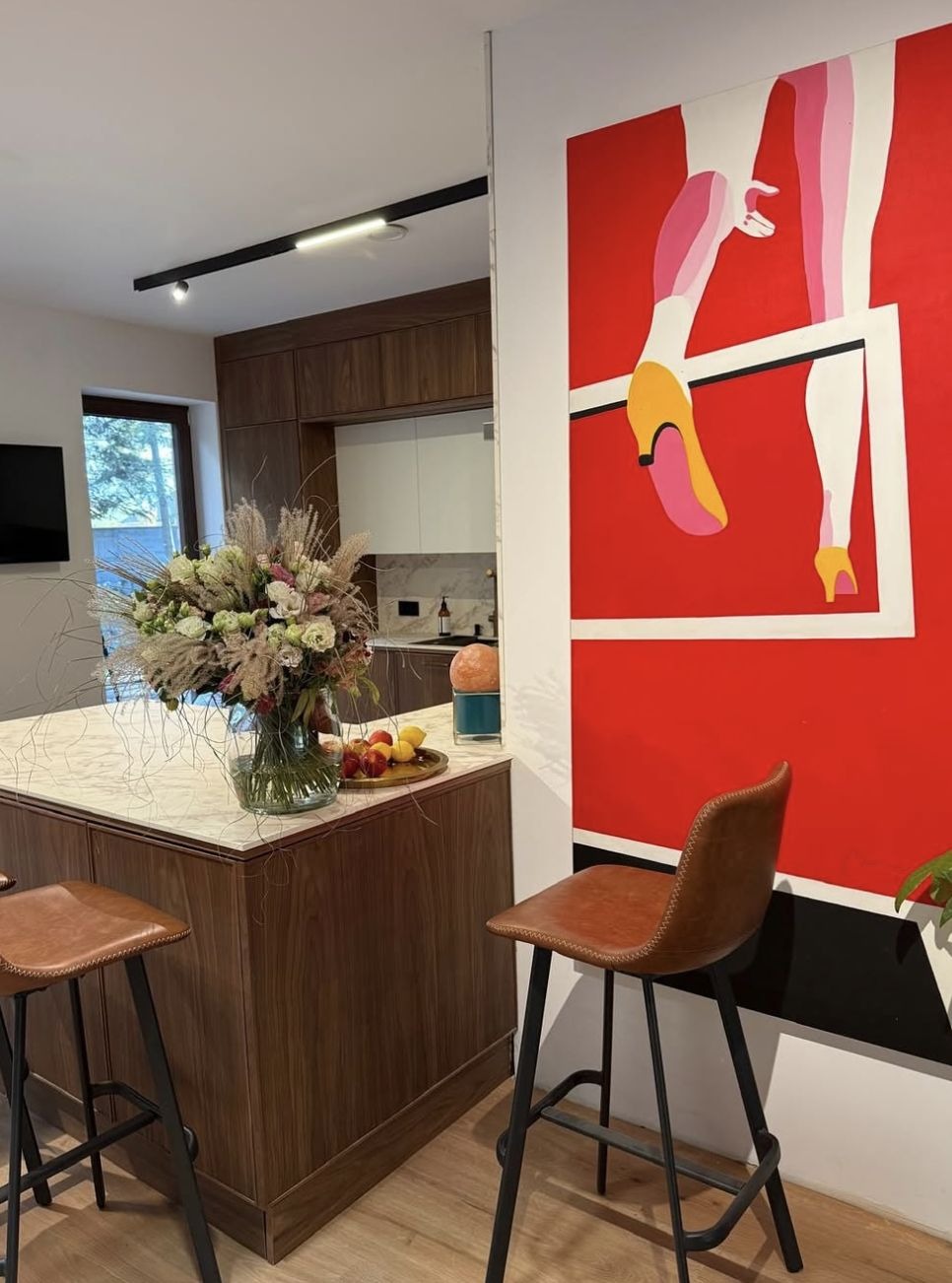 Najwięcej komentarzy dotyczy jednak kuchni. Biel, naturalne drewno i marmur tworzą spójną, klasyczną kompozycję, która nie jest chłodna ani sterylna. Duża wyspa pozwala na wspólne spędzanie czasu, a intensywnie czerwony obraz dodaje wnętrzu charakteru i przełamuje spokojną paletę barw.