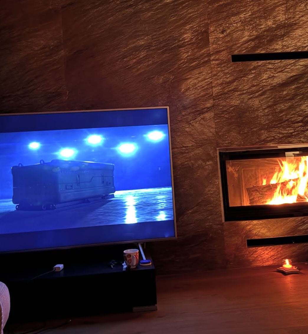 Salon stopniowo zyskiwał charakter. Pojawił się duży telewizor, kominek oraz ściana wykończona wielkoformatowymi płytami, które nadały wnętrzu nowoczesnej elegancji. Białe ściany i przestronny wypoczynek stworzyły bazę, która łączy minimalizm z domowym ciepłem.
