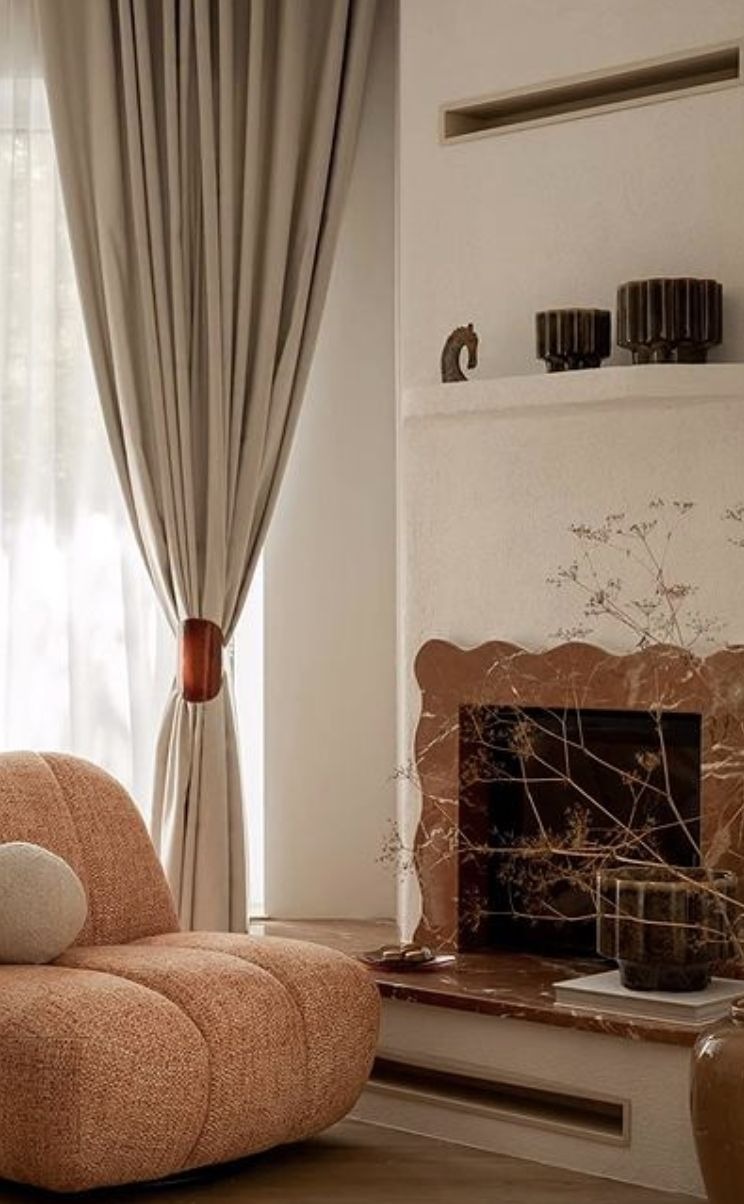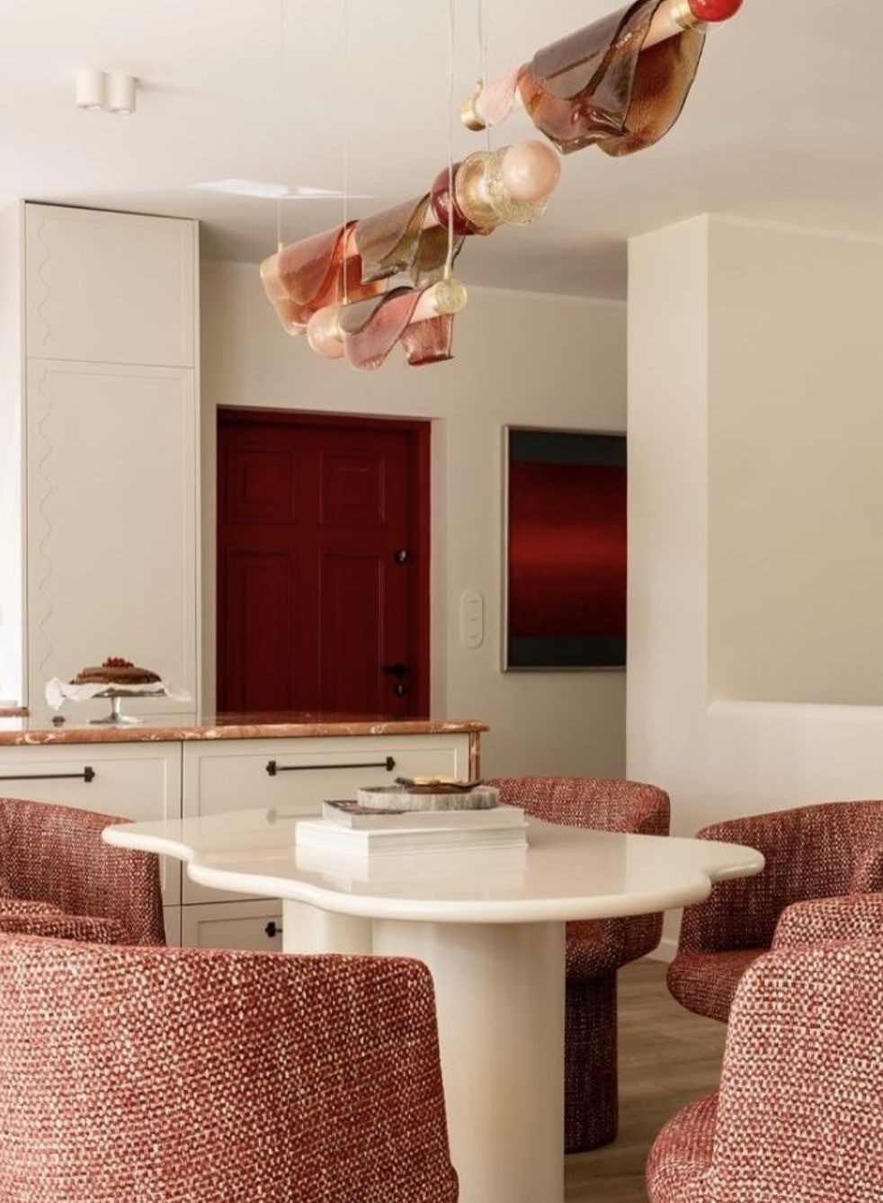 Salon to serce domu. Dominuje w nim duża, beżowa sofa zestawiona z ciemnym stolikiem i wzorzystym dywanem. Ogromne okna wpuszczają naturalne światło, dzięki czemu wnętrze jest jasne i ciepłe bez potrzeby intensywnego doświetlania. Uwagę przyciągają też nietypowe fotele w odcieniach różu i czerwieni oraz połyskujący stolik, które nadają całości artystycznego charakteru. Całość spina wyrazisty żyrandol i czerwone drzwi, obok których trudno przejść obojętnie.