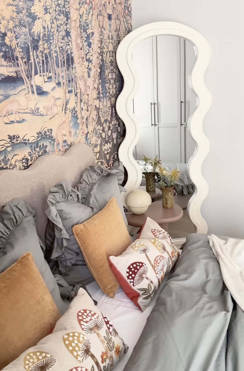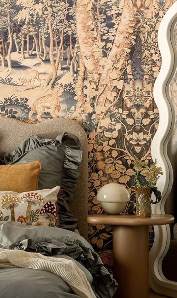 Sypialnia to zupełnie inna historia. Bohosiewicz zdecydowała się na tapetę z motywem dżungli i zwierząt, która nadaje wnętrzu nieco teatralnego klimatu. Na jej tle stanęło minimalistyczne łóżko, proste stoliki nocne i designerskie lustro. Detale — poduszki, kwiaty i dodatki — sprawiają, że całość wygląda jak prywatny hotelowy apartament.