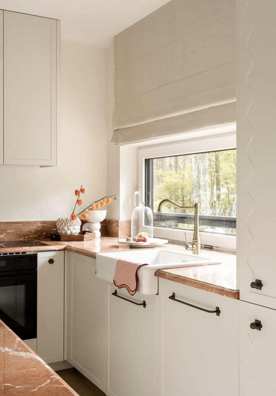 Kuchnia została urządzona z rozmachem, ale bez przesady. Króluje tu biel połączona z brązowym marmurem, który pojawia się również w salonie przy kominku. Dzięki temu przestrzeń jest spójna i elegancka, a jednocześnie bardzo funkcjonalna.