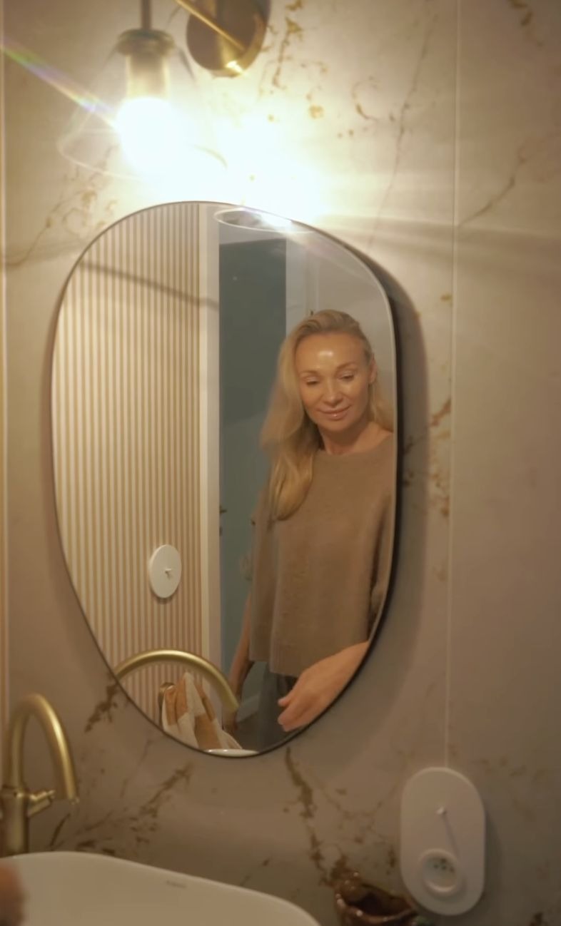 Równie efektownie prezentuje się łazienka. Jasne, duże płytki zostały zestawione ze złotymi elementami — od baterii, przez uchwyty, aż po prysznic. Centralnym punktem jest owalne, podświetlane lustro, które nadaje wnętrzu nowoczesnego sznytu.