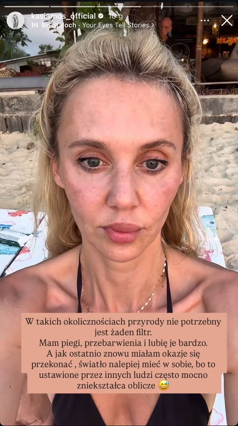 „W takich naturalnych okolicznościach filtr nie jest potrzebny. Mam piegi i przebarwienia, i kocham je. A jak ostatnio miałam okazję się przekonać, najlepiej jest mieć światło w sobie, bo to, które ustawiają inni, często znacznie wypacza twarz” – napisała artystka.