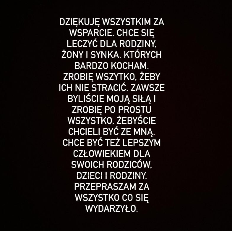 Daniel podkreślił, że chce zawalczyć przede wszystkim o rodzinę. W swoim wpisie zwrócił się bezpośrednio do rodziców, żony i dzieci. Nie ukrywał, że to właśnie oni są dla niego najważniejsi i to dla nich chce się zmienić.