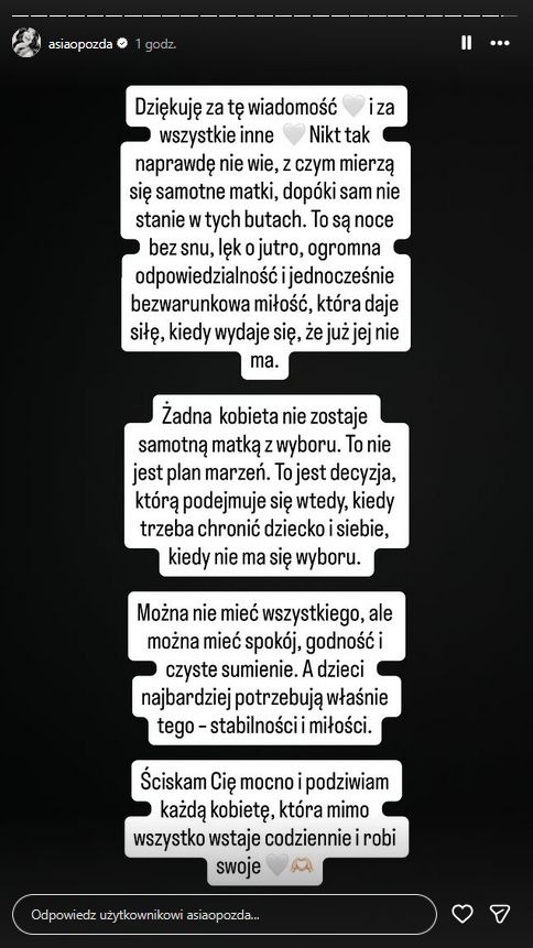 Po publikacji relacji Opozda udostępniła wiadomość od jednej z obserwatorek, która napisała, że również wychowuje dziecko samotnie i że Joanna jest dla niej inspiracją. Aktorka postanowiła odpowiedzieć i przy okazji podzielić się refleksją na temat samotnego macierzyństwa.