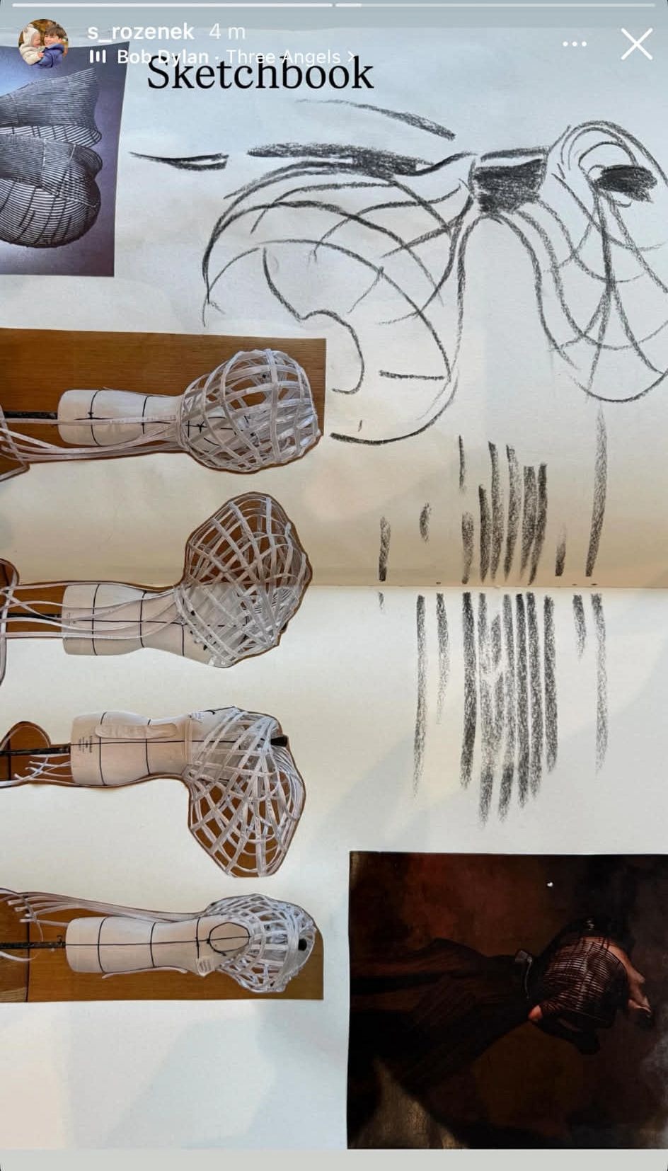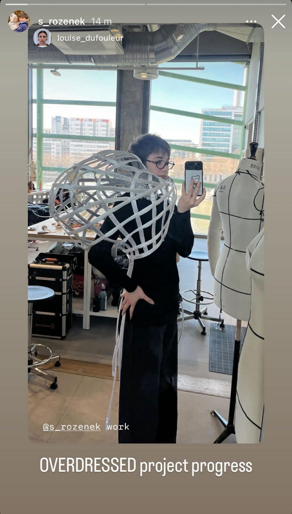 Tym razem jednak postawił na zupełnie inną formę. Na potrzeby egzaminu przygotował ażurową konstrukcję będącą jego interpretacją tematu „overdressed”. Projekt wyróżnia się nietypową strukturą i eksperymentalnym podejściem do sylwetki, pokazując, jak młody student interpretuje współczesną modę.