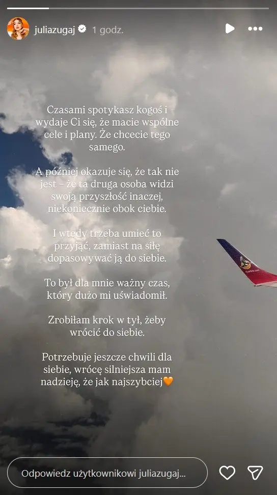 Teraz wszystko stało się jasne. Julia opublikowała w mediach społecznościowych zdjęcie nieba widzianego z samolotu i dołączyła do niego szczere wyznanie. Jej słowa były spokojne, ale pełne emocji.