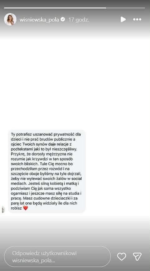 Autorka wiadomości zwróciła uwagę na to, że Pola — w jej opinii — chroni prywatność swoich dzieci i nie przenosi konfliktów do internetu. Jednocześnie zasugerowała, że ojciec chłopców przedstawia swoją wersję wydarzeń w sposób, który może sugerować jego niezadowolenie z relacji.