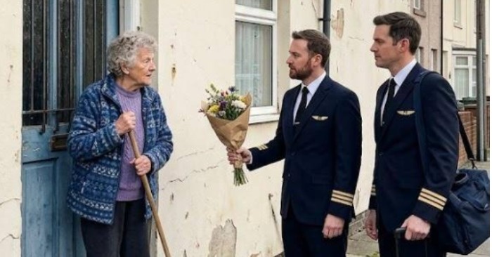 Dwóch mężczyzn w mundurach pilotów stało przed nią.
