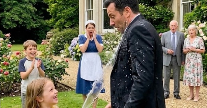 Strumień wystrzelił z siłą — i zamiast trafić w wypolerowane buty, uderzył prosto w eleganckie spodnie Alejandro, przemoczył delikatny materiał i ochlapał jego białą koszulę. Zamarł. Głos w telefonie wciąż mówił, ale on powoli go opuścił. Kiedy się odwrócił, jego twarz była wykrzywiona gniewem.