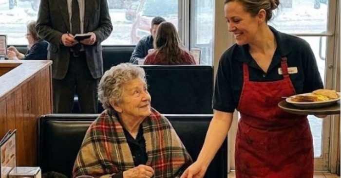 Jej słowa zawisły w powietrzu, niemal jak zaproszenie. Ledwo pan Winters wyszedł w śnieg, drzwi nagle otworzyły się z hukiem, wpuszczając do środka wyjący wiatr. Ale to nie był rosły kierowca ciężarówki ani policjant. Do środka weszła krucha starsza kobieta, drżąca z zimna, ubrana w płaszcz zdecydowanie zbyt cienki na tak brutalną pogodę.