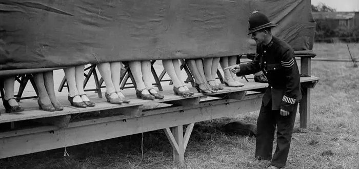 „Zasłona, rząd nóg… i mężczyzna oceniający w milczeniu” 🤔👠 To dziwne zdjęcie z lat 30. XX wieku kryje w sobie zaskakujący powód – czy potrafisz zgadnąć, dlaczego zostało